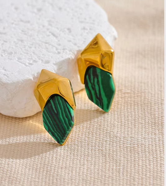 Malachite Stone Geometric Green Stud Earrings 18K Real Gold Plated